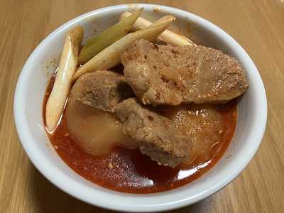 約2ヶ月ぶりにコウケンテツさんレシピのルウカレーを使ったポークカレーを作りました。具材は適当な感じで決めてます。今回は家に大根と玉ねぎがあるとのことで、それを入れることしました。〜材料と作り方(4人前)〜・豚肉小間切り落とし肉 約200g・大根 1/4本・玉ねぎ 1/2玉フライパンで豚肉を色が変わるまで炒める。塩を少々とチューブのにんにくを入れる。玉ねぎ、大根も一緒に炒める。水450gを入れる。カレールウ3個を細かく切って入れ、約10分煮込む。キムチ75gを入れる。しょうゆ 小さじ1.5みりん 大さじ1上の調味料を投入、さらに約10分煮込んで完成です。オーソドックスなルウカレーですが、キムチで味にコクがでます。具材は、基本的には何でも合うと思いますが、作っているときに、今度はきのこを入れて作ろうかなと思いました。勝手に煮込む時間を長くしているので、10分では作れませんが、今回も美味しくできました。また作ります。大根は煮崩れしないのが良いです