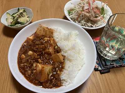 約2ヶ月ぶりにマーボーカレーを作りました。少ないレパートリーの1つです。材料・豆腐(木綿)2㎝角にカット…約380g(1パック)・豚ひき肉…約180g・塩…ひとつまみ・ニンニク(粗みじん切り)…2かけ・長ネギ(みじん切り)…1/2本・サラダ油…大さじ1・A[豆板醬…大さじ1 オイスターソース…大さじ1 ラー油…小さじ2]・水…250ml・B[酒…大さじ1 はちみつ…小さじ1]・カレールウ…2片・温かいごはん…200g・ラー油、糸唐辛子、花椒(好みで)…各適量毎回ですが、豆板醬をコチュジャン、甜麵醬をオイスターソース、ラー油をごま油に置き換えて作りました。先ずは麻婆豆腐から調理します。ニンニク、長ネギを粗みじん切りします。豚ひき肉を炒めます。脂が溶けてきますが、脂が無くなって、少し焦げ目がついてカリカリになるくらいです。そこにニンニクを入れます。コチュジャン大さじ1、オイスターソース大さじ1を入れます。ごま油を小さじ2入れます。肉味噌みたいになります。ここまでがポイントだと思います。※今回はひき肉の脂が多くなりました水250ccを入れます。酒大さじ1、ハチミツ小さじ1*ハチミツが無かったので、家にあった水飴にしました。ここでカレールウを2片入れます。※刻んで入れると早く溶けます豆腐を入れます。2cm角くらいにしました。約2分程度煮立てます。長ネギを入れて混ぜます。少し水を足します。今回は30ml足しました。味を確かめて完成です。作る行程が多少適当でも毎回上手くできます。安定した美味しさです。また作ります。PS 2人だと2回食べることができます1日目の盛り付けた感じサラダは無限キャベツのもとを使って作りました。やみつきにはならないかな2日目の盛り付けた感じ