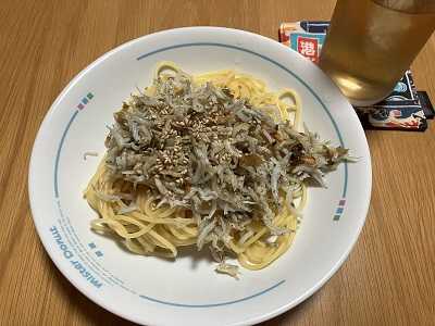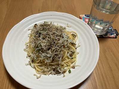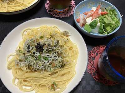 調理が簡単なので、またまた、コウケンテツレシピのしらすパスタを適当にアレンジして作りました。9月は毎週作ってます。【材料(2人分)】・青ねぎ 少々・にんにく:1かけ・高菜:適宜・スパゲティーニ:160g・お湯:1.5L・塩:大さじ1・オリーブオイル:大さじ2~3・しらす:約80g・しょうゆ:少々・白いりごま:適宜・仕上げ用のオリーブオイル:適宜・粗びきこしょう:適宜オリーブオイルでにんにくを炒めて、オリーブオイルをにんにく風味にします。そこにしらすを入れて軽く炒めます。そして、青ネギと辛子高菜を入れてさらに炒めて具の完成です。具を作るのと並行して、茹で水に塩大さじ1を入れてパスタを茹でます。パスタは具材と和えるので、湯切りはしないで皿に盛り付けます。今回も茗荷を青ネギにして、大葉も入れてません。レシピと別物になってますが美味しかったです。きっと「しらす」のオイル炒めは何にでも合うのだと思います。また作ります。盛り付けた感じです