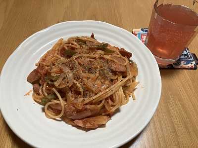 今週もスパゲティを作りました。コウケンテツさんレシピの「大阪喫茶ナポリタン」です。作るのは今回で6回目になるみたいです。最初に作ったのは、コロナでリモートワークになって、家で料理でもしようかなって思ったからです。このレシピは人気があるみたいで、コウケンテツさんも3つくらいバージョンを変えた動画をアップされてます。最初は茹でたスパゲッティをマヨネーズで和えたりしていましたが、それはなくなりました。ピーマンも入れるようになってます。やはり普通に作れるほうが良いです。【材料(2人分)】・玉ねぎ:1/2個・ウインナー:4本・ピーマン:1個・スパゲティー:160g・塩:大さじ1・サラダ油:適宜・にんにくのすりおろし:1かけ・トマト缶:1/2・ウスターソース:小さじ1・バター:20g・粉チーズ:大さじ1+お好み最初に材料をカットしたり準備してから、炒めていきます。途中くらいからスパゲティを茹でて、茹で上がりと同時に、フライパンで合わせて完成です。トマト缶で作っているので、ケチャップの味付けよりはあっさりした感じがしますが、美味しいです。カミさんにも好評でした。また作ります。PS 最近は手軽なのでスパゲティを作ることが多くなってます。盛り付けた感じです