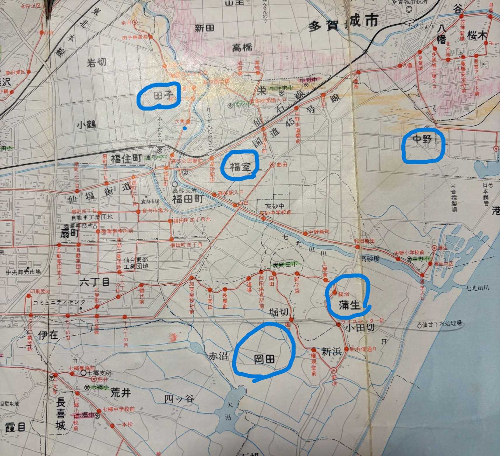 宮城電気鉄道の第1期線である仙台ー西塩釜間は、大正12年8月に工事に着手し、大正14年6月5日に営業を開始した。高砂村でも、福田町停留所、高砂停車場で、部落有志が村当局とともにそれぞれ設備をなして祝意を表した。しかし、福田町、高砂の両駅をめぐっては激しい紛糾があった。この福田町停車場問題は、福田町駅と高砂駅のいずれにするかで、当時の政友会と民政党の政治問題にもなって紛糾し、結局双方に設置することとなったものである。■参考 佐藤芳男『仙石線物語』2017年(本記事はおだずま再構成。なお、佐藤さんは1937年塩竈市生まれ、日本共産党塩釜地区委員長をされた。塩釜時事新報の連載をまとめた本とのこと。)1 問題のはじまり会社は福田町停留場の位置について、大正12年6月に認可を得ている。用地買収を始めた当初、数名の地主が応じないので、土地収用法の適用も考えたが年月を要するので、むしろ予定地点を放棄して高砂駅を設置しようとした。これは宮城電鉄社長山本豊次談によると(後出大正14年2月5日河北新報)、中野に停留所を要望された際(次の段落に叙述)に種々考えた結果なのだという。中野の要望とは、大正12年12月、高砂村長遠藤音右衛門、多賀城村長鎌田猛両名の連署で、田子と八幡の中間の中野字只屋敷地点(おだずま注、現在の中野栄駅近くのようだ)に停留所設置の請願書が出された。請願の趣旨として、中野字只屋敷に隣接する部落は出花、曲田、蓬田、向田、追分、沼田、北新田の各区と多賀城村の高橋区、停留所が設置されると利便性が生まれるのは高砂村和田、蒲生町及び中野成区で、これらの部落には戸数540、人口3300余おり、県道、鉄道が通ると将来村の開発、交通運輸、子弟の教育の便が成る。請願地点の停留所は前記部落民の乗降が最も便宜の位置で、この地点を通過するだけでは、田子、福室両部落が恩恵に与るだけ。村と部民のためこの地点に停留所を設置すべき。この中野案は会社側が停車場との間が短距離なので設置しないことにしたのを知り、高砂郵便局長花淵源吉などが、中間地点の北福室に変更するよう山本社長に懇請し、安価で敷地や人夫の提供も申し出る。会社は調査の上、建設費の少額などを理由に北福室に変更申請を行うこととなった(大正13年9月20日)。これを知り福田町の有志家たちが会社側と交渉、政治家にも運動方を依頼して、部落の間の紛糾となったものである。1-2 (おだずま解説)旧村についてここで、地域を知る前提として旧村を記しておく。宮城郡(陸方2郷27村)のうち、明治22年の町村制施行の際に、岡田、蒲生、田子、中野、福室の5村が、高砂村となる。上の地図は昭和50年代のもの。まだ中野栄駅はない。2 福田部落の対応福田部落は大正13年7月頃から、従来通りの福田町停車場を請願してきたが、同年9月鉄道大臣に陳情書を提出。高砂村会議員佐藤松三郎など10名、区長10名、吉田源太郎外4500名の連記署名入り。陳情の趣旨は、こうだ。大正12年に宮電が工事にあたり、停車場を高砂村福田町字原嶋に設置するから線路敷地の買収を社長から依頼された。高砂村長が町民に訴え、佐藤松三郎、菅野源太郎を代表として、将来の村の発展のため私利をなくし安価で会社の買収に応じるよう、所有者との交渉を働きかけ、約1800坪を確保した。工事中の田畑への被害も我慢してきた。すでに認可が下りたにもかかわらず、敷地が水害にあったことがないとは疑わしいと言い立て、それを口実に福室部落に移転するという。福田町は高砂村の中枢で、役場、小学校、郵便局もあり、居住する住民も福室部落の10倍、もし福室に移転するなら多数の住民は不便を強いられるから、移転認可をせず直ちに取り消すように、と陳情している。県選出代議士藤沢幾之助外5代議士を介して嘆願書も提出している。3 福室部落の対応他方、福室部落を中心に大正13年10月、県知事上田満平あてに「請願書」及び「宮城電気鉄道停留所位置認可指令請願理由書」が提出された。この概略は、高砂村は中野、蒲生、福室、岡田、田子の旧5か村からなり、田畑1800余町歩、戸数1200、人口8000余の県下唯一の大村で、仙台塩釜の中間に位置し仙塩県道が中央を通る交通上便利なところだが、七北田川が交通上障害となり中野、岡田、田子の3か所に分かれ経費が膨張し村民負担が増大、この解決が求められている。停車場の予定変更は村民の希望と一致しており、村の最西端の荒寥たる田野に面した福田町停車場予定地はほとんどの村民は便益を受けず、中野停留所の設置を要望することになった。新旧予定地の比較がある。・新予定地区(部落) 中野五区、蒲生二区、福室一区、多賀城高橋、新田(十区)戸数 7百余人口 5千・旧予定地区(部落) 田子四区、福室一区、岡田二区(七区)戸数 4百余人口 3千6百さらに、新予定地の利点があげられる。福田橋を起点としてみれば、旧予定地周辺のうち岡田二区はむしろ新予定地の方が便利という。また、旧予定地は仙塩県道と3百間