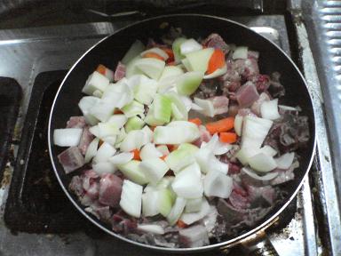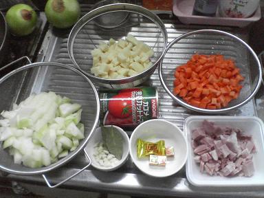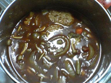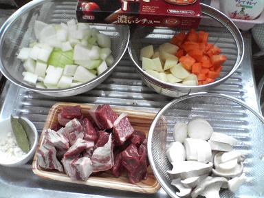 今日はシチュー。ジャガイモ、玉葱、人参、エリンギ、牛肉などを用意・・・フライパンにオリーブ油を入れ、牛肉から炒めます。次に野菜類を入れて炒めます。焦げないように火を通します。火が通ったら鍋に移して5分ほど煮込みます。アクを取り、真空断熱調理器に30分ほど入れておきます。30分過ぎたころ、取出し、ルーとバターとチャツネを入れて5分ほど煮込みます。再び真空断熱調理器に1時間ほど入れておきます。完成。ご飯にかけて頂きます。肉が柔らかく仕上がりました。真空断熱調理器・・結構使えます。