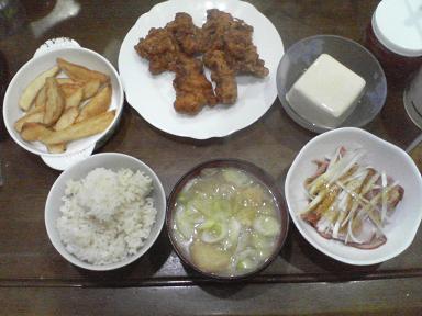 今日の夕飯は唐揚げ。その他諸々・・唐揚げの素で揚げた唐揚げ・・ポテトも頂きます。おつまみ用のネギチャーシュー・・ネギとあぶらげの味噌汁も頂きます。年度末でさすがに忙しいようです。たくさん食べてパワーアップ?