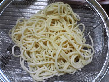 今日はパスタ。各人、お気に入りのソースで頂きます。私は唐辛子とガーリックとオリーブ油でペペロンチーノ風・・これは?バジルソース風?実はガーリックソースに青のりと醤油を少量入れた物です。結構いける・・・子供たちはミートソースとタラコバター味で食べていました。各人、色々な食べ方で楽しめたようです。