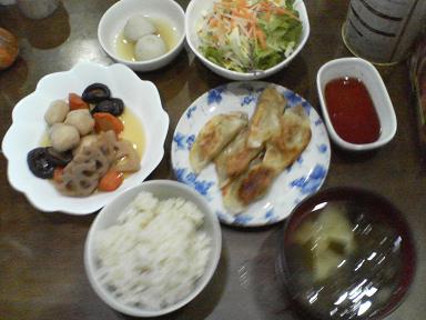 今日の夕飯は既製品。少々多忙なため・・定番のお手軽な冷凍餃子・・レトルトの筑前煮・・以外に味が染みておいしいです。味噌汁はジャガイモとワカメ・・・時間のない時は簡単に頂きます。