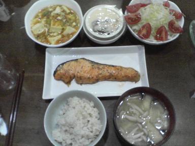 今日はシャケのバジルソース焼き。市販のバジルソース漬けのシャケをオリーブ油で焼きます。麻婆豆腐が少し余っていたので頂きました。キャベツとトマトのサラダも頂きます。やっぱり今日も忙しく、遅い夕飯になってしまいました。