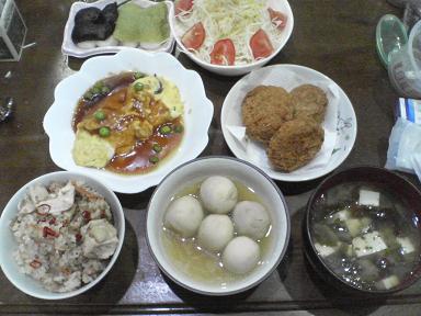 今日の夕飯は色々・・何やら消費期限の関係で食べなければいけない物が結構出てきました。揚げ物・・一口カツ・・あんかけ卵も頂きます。市販の素を使用・・里芋の煮物・・ご飯は鶏の炊き込みご飯です。市販の素を混ぜて炊き上げます。キャベツサラダも頂きます。オリーブ油とシーズニングで頂きます。少しずつ、いろいろと頂きました。でも、あまりバランスが良くないかも・・