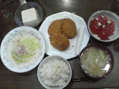 今日の夕飯は色々・・まずはキャベツのスープ。ついでに味噌汁も頂きます。トマトのサラダ。チーズをトッピング・・メインディッシュはコロッケ・・冷凍物ですが、揚げたてはおいしいです。今日はお腹が空いていたので、ちょうどよく頂きました。