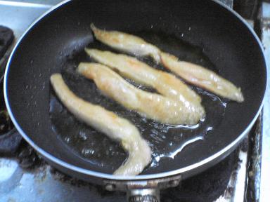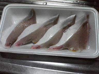 今日はシャケのハラス焼き。フライパンにオリーブ油を入れ、シャケのハラスを焼きます。適当に返しながら火を通します。こんがり焼けたら完成。醤油とレモン汁で頂きます。今回のハラスは塩味が濃く、お茶漬け向きでした。少し減塩しないと・・