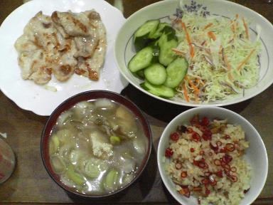 今日の夕飯は豚肉と炊き込みご飯・・・豚肉はガーリックのみ振り掛けてシンプルに焼きます。味噌汁は舞茸とネギ・・キャベツと胡瓜のサラダも頂きます。ついでにマッコリで一杯・・・何やら食べ過ぎてしまいました。体質なのか、酔うと食欲が倍増するようです。