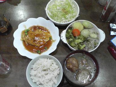 今日は煮物?何やら肉じゃがの模様・・・家人作成ですが、かなり薄口に作ったとのことです。塩分控えめ・・・・と思ったら色が薄いだけでしっかり味は付いていました。あんかけ卵も頂きます。キャベツサラダはオリーブ油とシーズニングで頂きます。チーズもトッピング・・今日もしっかり頂きました。