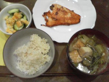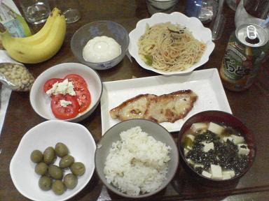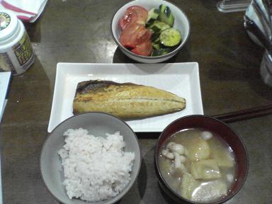 今日は鯖のオリーブ油焼き。塩鯖をフライパンでオリーブ油焼きにします。味噌汁はシメジとあぶらげ・・・胡瓜とトマトも頂きます。今日もとても忙しく、夕飯はシンプルに頂きました。そういえば、昼食も鯖だった・・・