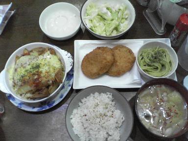今日は煮込みハンバーグとチーズポテト。玉葱の輪切りとハンバーグを市販の素で煮込んだものです。余ったフライドポテトに、これまた余ったミートソースをかけて、ピザ用チーズを乗せて焼いたものです。玉子スープも頂きます。今日も何かと多忙でした。しっかり頂いてパワーアップ・・・