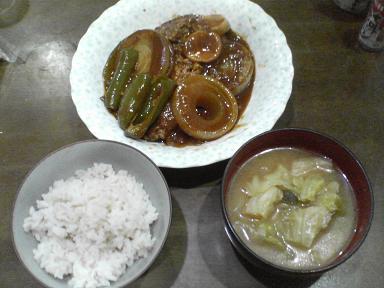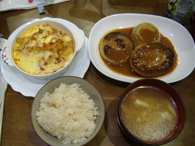 今日は煮込みハンバーグ。家人作成・・・このところ忙しいので、家人にお任せ・・・キャベツとあぶらげの味噌汁・・・今日も遅い夕飯でした。