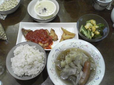 今日の夕飯はカツ・・・市販のカツにトマトソースをかけて頂きます。ポテト付き・・・キャベツとソーセージのスープ。粗挽きコショーで頂きます。胡瓜も頂きます。今日は雨の中、外で仕事だったので疲れてしまいました。温かいスープでパワーアップ・・・