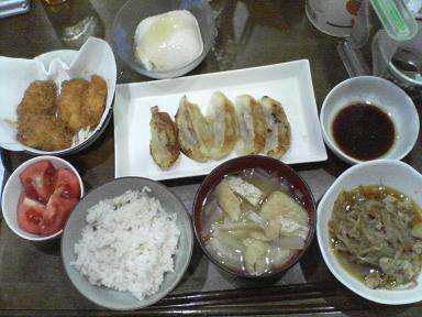 今日は出来合のおかずを頂きます。餃子・・冷凍物です。豚肉とモヤシの煮物?串カツも頂きます。ミニサイズ・・・味噌汁は大根とあぶらげ・・・トマトも頂きます。今日はお手軽メニューですが、おいしく頂きました。