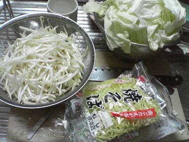今日は焼そば。モヤシ、キャベツなどを用意・・・フライパンにオリーブ油とスライスにんにくを入れ、豚肉から炒めます。モヤシ、キャベツなどを入れます。オイスターソースと料理酒も加えます。火が通ったら、麺とソースを加えて炒めます。今日は塩味・・・仕上げにバターを少々加えて完成。早速頂きます。ナメコの味噌汁付き・・・久しぶりの焼きそば・・美味しく頂きました。