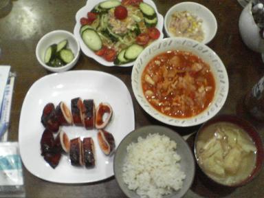 今日はイカ焼きとパスタサラダとトマトスープ。パスタサラダとトマトスープは家人作成・・・まずはイカ焼き・・・フライパンにオリーブ油を入れ、イカの味醂漬けを焼きます。完成。とりあえず、切ってみます。パスタサラダ。冷やしメニューとか・・トマトスープ・・キャベツと玉葱のみじん切りをホールトマトの缶詰めとコンソメで煮たものです。ベーコンとシメジ入り・・・なぜか味噌汁も頂きます。今日はキャベツとあぶらげ・・・疲れたときはたっぷり頂きます。体重も順調に増加・・・