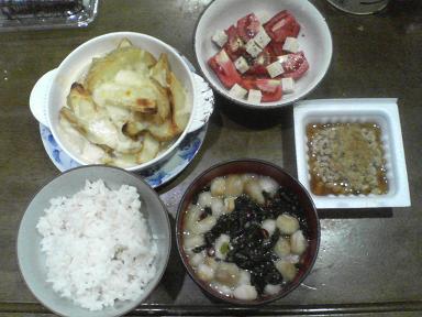 今日の夕飯はなぜかチーズポテト焼き。フライドポテトにピザ用チーズを乗せてオーブンで3分ほど焼きます。チーズがとけたら完成。味噌汁も頂きます。ワカメと麩・・トマトサラダ・・・チーズとコショーがおいしいです。大したものではありませんが、おいしく頂きました。