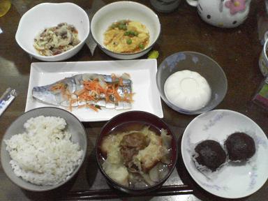 今日は〆鯖がメイン・・・家人が見つけてきた鯖。〆具合が丁度良いとか・・・あんかけ玉子・・ミニサイズです。豚肉とシメジの炒めもの・・味噌汁はキャベツと油麩・・・デザートにミニおはぎも頂きます。今日もしっかり頂きました。