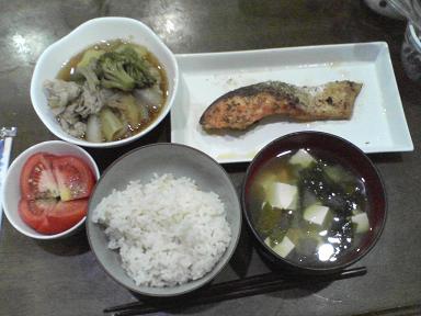 今日はシャケ。なぜかレバ刺しみたいな蒟蒻も頂きます。味噌汁は、白菜と油麩・・・トマトも頂きます。今日も忙しかったのですが、しっかり頂きました。