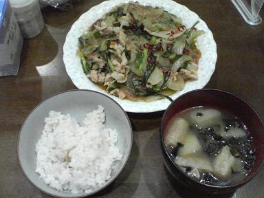 今日ははるさめ。フライパンにオリーブ油を入れ、豚肉と野菜炒めます。火が通ったら、はるさめと市販の素を入れて炒めて完成。唐辛子をトッピング・・・味噌汁はジャガイモとワカメ・・・結構ボリュームがありました。お腹いっぱい・・・