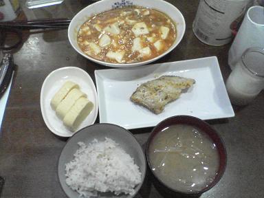 今日の夕飯は麻婆豆腐がメイン・・何やら分量が多いようです。食べきれるのでしょうか・・焼き魚も頂きます。市販の玉子ロール?結構味が濃いようです。今日はお腹が空いてしまい、たくさん頂きました。
