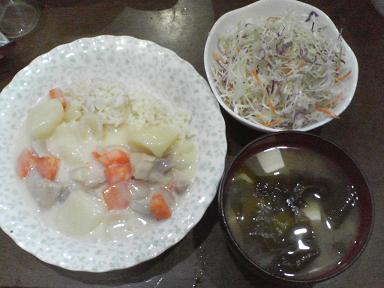 今日はシチュー。家人作成・・何やら子供たちのリクエストでホワイトシチューになったようです。キャベツサラダも頂きます味噌汁はワカメと豆腐・・・今日もおいしく頂きました。