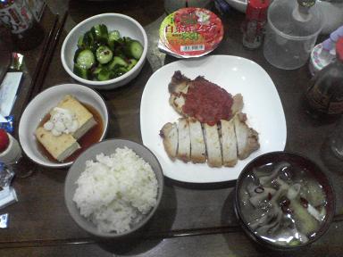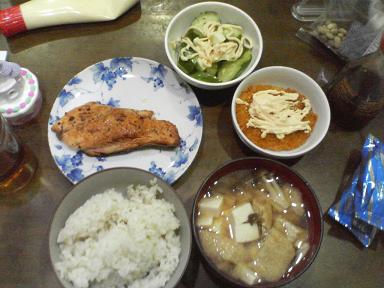今日の夕飯はシャケ・・シャケのバジルソース焼き・・市販のタレ付きのものです。なぜかマヨネーズが無性にたべたくなり、冷蔵庫にあった明太子入りマヨネーズをたっぷりかけてみました。コロッケと胡瓜、少しかけすぎ?味噌汁はシメジとあぶらげ・・今日は月初。何かと忙しい一日でした。疲れたときは食べるのが一番?