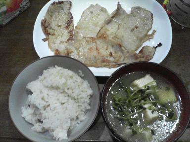 今日は豚肉を頂きます。家人作成の豚肉ソテー。何やらミラノ風とか・・揚げ豆腐も頂きます。味噌汁は舞茸とあぶらげ・・・胡瓜の浅漬けも頂きます。今日もおいしく頂きました。