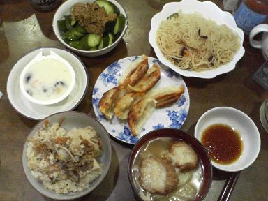 今日の夕飯は色々・・・ご飯は鶏の炊き込みご飯です。餃子も頂きます。少々焦げ気味?定番のビーフン・・・味噌汁はキャベツと油麩・・胡瓜も頂きます。トッピングにブラックペストソースをかけてみました。イタリア風?今日はお腹が空いてしまったので、いろいろと頂きました。お腹いっぱい・・・