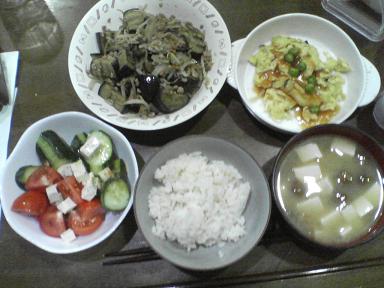 今日は茄子炒め。茄子、モヤシ、挽肉などを市販の素で炒めたものです。鷹の爪でピリ辛・・・あんかけ卵も頂きます。味噌汁は豆腐とナメコ・・・トマトと胡瓜も頂きます。今日もくたびれたので、たくさん頂きました。