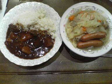 今日はシチュー。都合により、豚肉と牛肉を使いました。野菜スープ・・・ソーセージの塩分で程よく薄味が付いています。ようやく週末・・・パワーアップしないと。