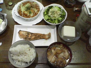 今日はグラタンとシャケ。家人作成・・ミートソース風味のグラタンにチーズをかけて焼きます。オーブンで5分ほど焼くと完成。シャケも頂きます。シーズニング焼ですが、少しかけすぎのようです。サラダも頂きます。味噌汁は大根と油麩・・・今日は少々くたびれていたので、お腹いっぱい頂きました。