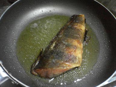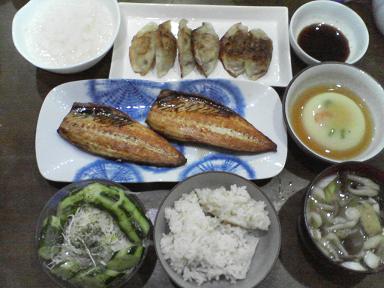 今日は鯖。フライパンにオリーブ油を入れ、鯖を焼きます。適当に返しながら焼きます。焼き上がり・・・餃子とツーショット?サラダも頂きます。味噌汁はシメジとあぶらげ・・・今日もおいしき頂きました。