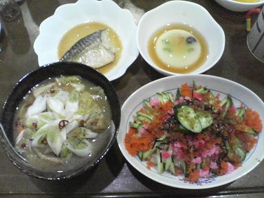 今日は五目寿司。ありあわせで作ります。ついでに豚汁風の味噌汁も・・・これもありあわせの材料で作ります。胡瓜、シシャモのタマゴ、胡麻、海苔、でんぶなどで作ります。卵豆腐も頂きます。豚汁風味噌汁・・濃いめの味にしました。なんだかんだで少々食べ過ぎてしまいました。