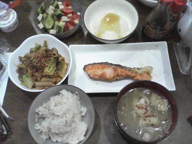 今日の夕飯はシャケとマカロニ・・何やら家人作成のボロネーゼとか・・シャケの西京漬けも頂きます。とりあえずサラダも・・・胡瓜とトマトを頂きます。味噌汁はモヤシとあぶらげ・・・今日もおいしく頂きました。