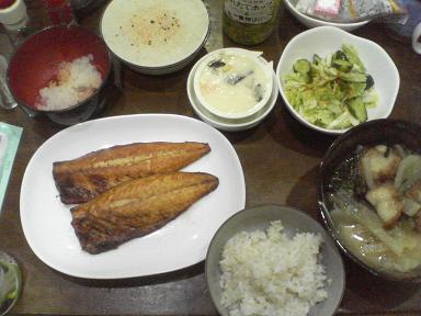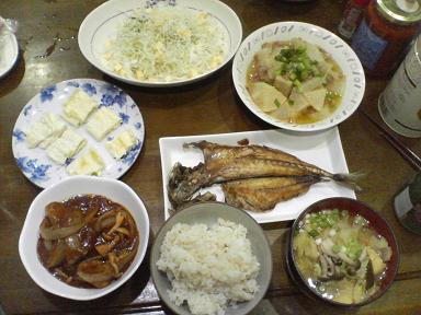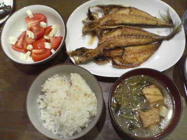 今日は鯵の干物・・その他諸々?フライパンにオリーブ油を入れ、鯵を焼きます。適当に返しながら火を通します。焼き上がり。大根と挽肉の煮物を頂きます。余っていた煮込みハンバーグの汁で玉葱を煮たものを頂きます。ハンバーグは子供たちが食べたので残っていませんでした。仕方がないので湯葉を頂きます。味噌汁はキャベツ、シメジ、あぶらげなど・・・キャベツサラダも頂きます。今日は色々と頂きました。お腹いっぱいです。