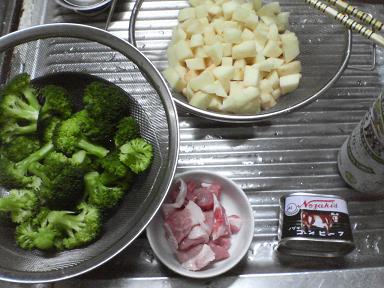 今日はコンビーフ炒め。ジャガイモとブロッコリーを用意・・・フライパンにオリーブ油とスライスにんにくを入れ、賽の目に切ったジャガイモを炒めます。豚肉とブロッコリーを入れます。火が通ったらコンビーフを入れ、混ぜ合わせます。塩コショーで味を調えます。仕上げにバターをくわえて完成。子供たちにあっという間に食べられてしましました。