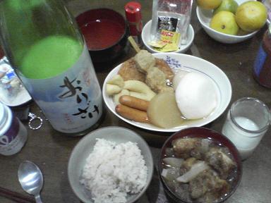 今日はおでん。濁り酒も頂きます。市販のおでんですが、おいしいです。なぜか大根と油麩の味噌汁も付いています。少し寒かったので、こんな日にはおでんが合います。今日もおいしく頂きました。