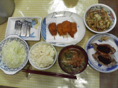 今日は〆鯖などを頂きます。〆鯖・・・キャベツ炒めも頂きます。串カツも頂きます。豚肉も頂きます。味噌汁は豆苗・・キャベツサラダも頂きます。今日もおいしく頂きました。