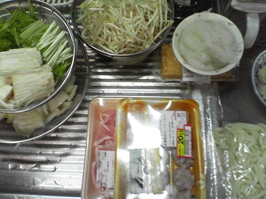 今日は鍋物を頂きます。モヤシ、エノキ、長ネギ、したらき、豚肉、小松菜、豆腐、すいとんなどを用意・・・鍋に昆布とダシを入れ、材料を入れて煮込みます。火が通ったら、ダシ醤油と味醂で味付けします。完成。今日もおいしく頂きました。