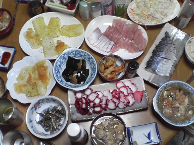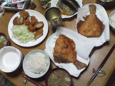 今日は揚げ物を頂きます。コロッケなど・・カレイの天麩羅・・年越しそばに付いていた鰊も頂きます。鰊そば用の余り・・・味噌汁はナメコ・・・今日もおいしく頂きました。