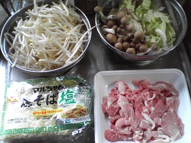 今日は鶏を頂きます。モヤシ、長葱などを用意・・・フライパンにオリーブ油を入れ、鶏肉から炒めます。火は通ったら、市販の炒め物の素を入れて完成。こちらは家人が食べた残りの鶏とシメジの炒め物・・・味噌汁はシメジ・・・キャベツサラダも頂きます。今日もおいしく頂きました。