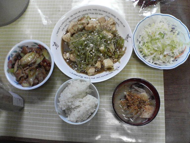 今日は鶏炒めを頂きます。鶏肉、長ネギ、人参、ピーマン、モヤシなどを用意・・・フライパンにオリーブ油を入れ、鶏肉などから炒めます。モヤシを入れ、料理酒を加えます。市販のあんかけ炒めの素と唐辛子炒めの素を混ぜて使います。完成。味噌汁は大根・・・キャベツサラダも頂きます。今日もおいしく頂きました。