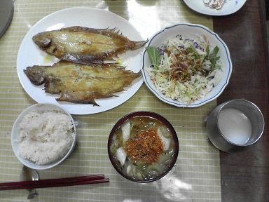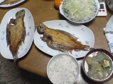 今日はカレイを頂きます。フライパンにオリーブ油を入れ、カレイの一夜干しを焼きます。弱火でじっくり火を通します。完成。縁側部分はショリショリで、ヒレのところがおいしいです。味噌汁は白菜・・・今日もおいしく頂きました。