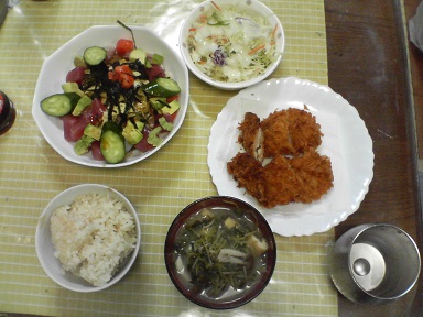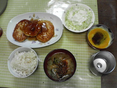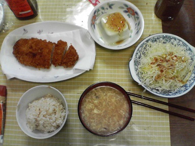 今日はカツを頂きます。家人作成・・・豆腐にはドレkッシングをかけてみました。卵スープも頂きます。キャベツサラダ・・・今日もおいしく頂きました。