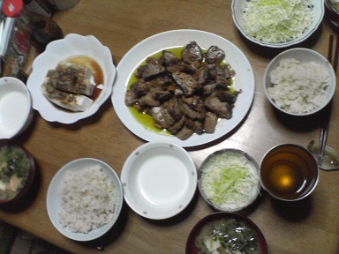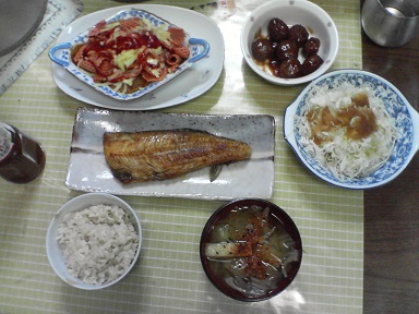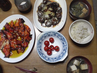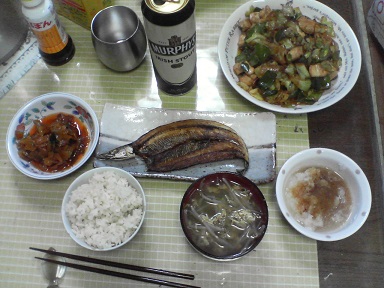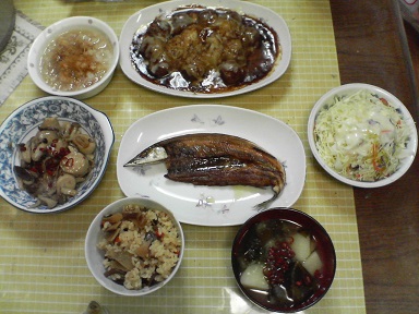 今日はサンマと肉団子を頂きます。フライパンにオリーブ油を入れ、サンマの開きを焼きます。完成。次は肉団子・・・ピザ用のチーズを乗せて電子レンジで加熱します。完成。キノコ炒めも頂きます。炊き込み御飯・・・サンマといえば、大根おろし?味噌汁は豆腐とワカメ。キャベツサラダも頂きます。今日もおいしく頂きました。