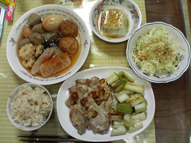 今日は豚肉などを頂きます。フライパンにオリーブ油を入れ、豚肉を焼きます。長葱のぶつ切りも焼きます。豚肉に火が通ったら、葱に上にかぶせて蒸し焼きのようにします。完成。おでんも頂きます。豆腐付き・・キャベツサラダも頂きます。今日もおいしく頂きました。