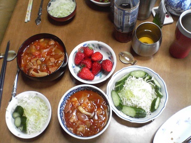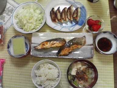 今日は魚を頂きます。サワラの類?名称不明・・・フライパンにオリーブ油を入れ、名称不明?の魚を焼きます。完成。餃子も頂きます。枝豆豆腐・・・手抜きでパッケージのまま?味噌汁は豆腐とワカメ・・・キャベツサラダも頂きます。デザートはイチゴ・・・今日もおいしく頂きました。